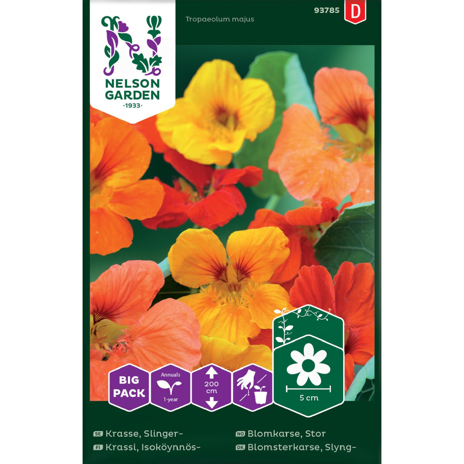 Fargesterk blomkarse med blomster i gult, oransje og rødt. Dyrkes gjerne i ampel, mot espalier eller som markdekker. Blomstene er spiselige. Bløtlegg frøene før såing, da spirer de bedre.
