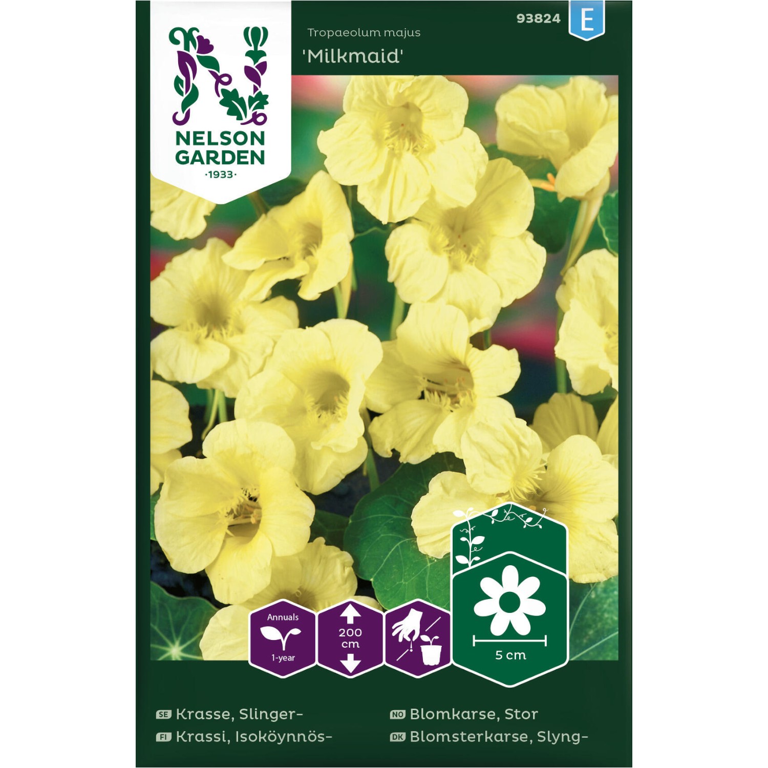 Herlig kremgul blomst med gyllent sentrum. Fin å dyrke i ampel, balkongkasse, mot espalier og som markdekker. Blomstene kan spises, dekorative i salater.