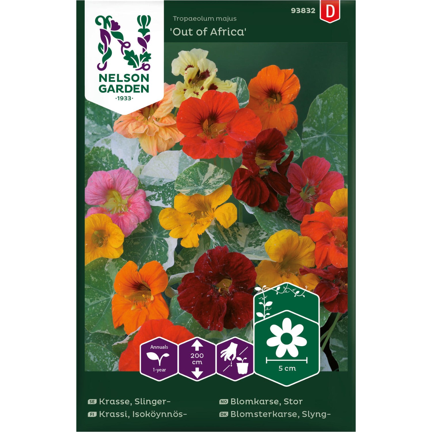 Blomkarse med hvitstripete blader og blomster i gult, oransje og rødt. Dyrkes gjerne i ampel, mot espalier eller som markdekker. Blomstene er spiselige. Bløtlegg frøene før såing, da spirer de bedre.